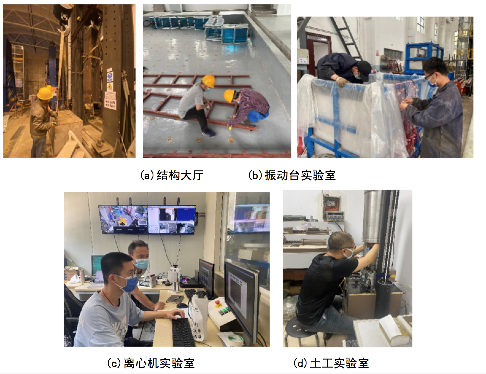 经过全校师生的共同努力,校内抗疫取得良好成效,社会面形势积极向好。根据学校的要求,四月下旬临时启用结构大厅,成为学校此轮疫情后首批复工的实验室之一。为了保障顺利复工,杨同帅老师和梁彪师傅第一时间申请进校,在采取多项措施保证安全的前提下开展加筋板材的疲劳实验,支撑了重大科研任务,保障了该项目的顺利进行。五月份陆续启用了离心机实验室、振动台实验室和土工实验室,郁建兵师傅也申请进校。杨同帅老师等人迅速投入到仪器设备检查检修、安全漏洞排查、实验模型准备、实验环境整修等工作中。在开展安全和防疫教育培训后,数名专业教师和近20名硕博研究生进实验室开展试验工作。在学校学院的大力支持下,师生齐力,克服人力物力不足等种种困难,使因疫情停摆了两个多月的实验中心重新启动,并按下“加速键”。