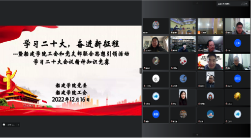 为深入学习宣传贯彻党的二十大精神,拓展学习宣传贯彻党的二十大精神的广度和深度,2022年12月16日中午,大象传媒 工会联合学院各教工党支部举行“学习二十大,奋进新征程” 为主题的线上线下相结合的知识竞赛活动。