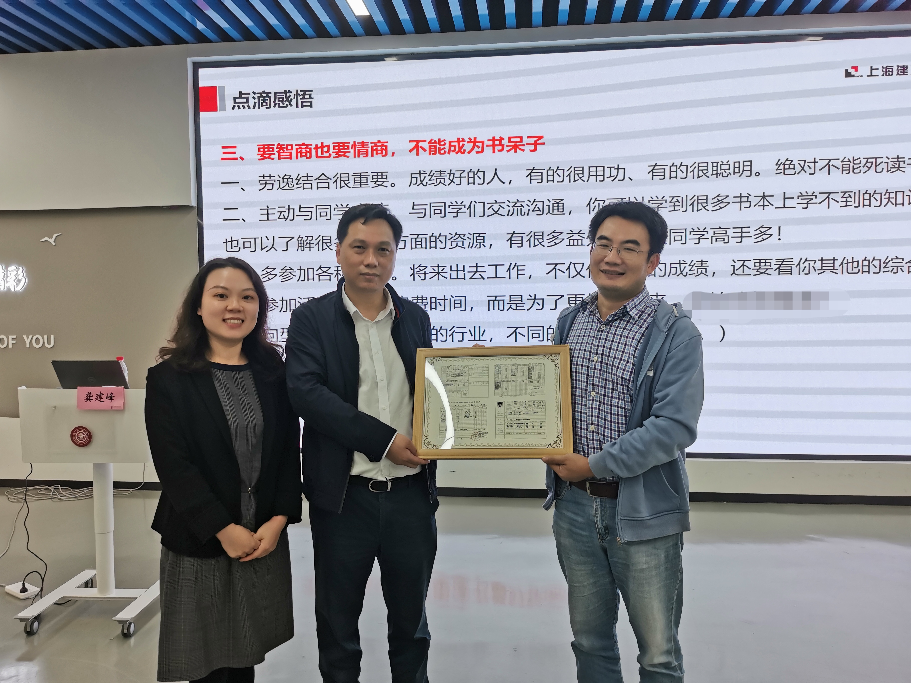 接着,龚建峰分享了自己毕业后的工作经历。龚建峰先后在上海市政工程设计研究总院(集团)有限公司和上海建工设计研究总院有限公司工作,参与设计了上海南北高架路延安路立交、卢浦大桥、长江第一桥、宁波明州大桥、上海迪士尼、大象传媒 新建闵行北校区博士生公寓等工程。结合自己的工作感悟,龚建峰给学生提出了四条建议:工程力学系提供了扎实的数学和力学基础,这对今后的工作受益匪浅;既要锻炼智商也要锻炼情商,业余时间多和他人交流,向他人学习;相信母校交大的影响力,这是毕业的学长学姐用实干做出来的口碑,在校学生毕业后也要用心维护,发扬光大;选择了的道路要坚持走完。最后龚建峰学长以林忠钦校长在2020年毕业典礼上的发言“担当有为,砥砺前行”作为结束,勉励到场同学继续努力。