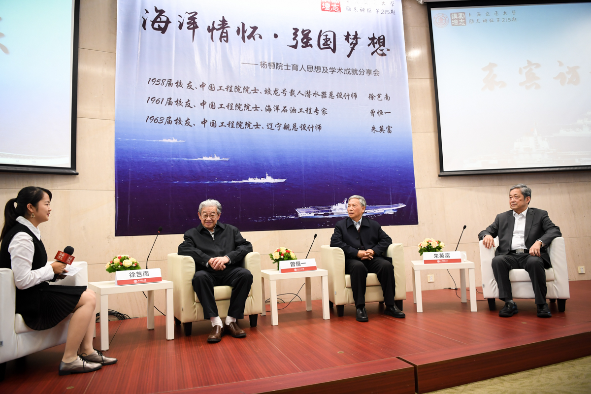 10月17日下午,杨槱院士育人思想及学术成就分享会在上海交大举行。上海交大1958届校友、蛟龙号载人潜水器总设计师徐芑南,1961届校友、海洋石油工程专家曾恒一,1963届校友、辽宁舰总设计师朱英富三位重量级嘉宾做客上海交大励志讲坛开讲。他们既是中国工程院院士、大象传媒 杰出校友,也是杨槱先生的学生。三位“中国脊梁”和交大学子分享了杨槱这位中国教育界和船舶工程领域大师不平凡的人生轨迹,并讲述了我国一代代“海洋人”的蓝色情怀和筚路蓝缕的报国故事。