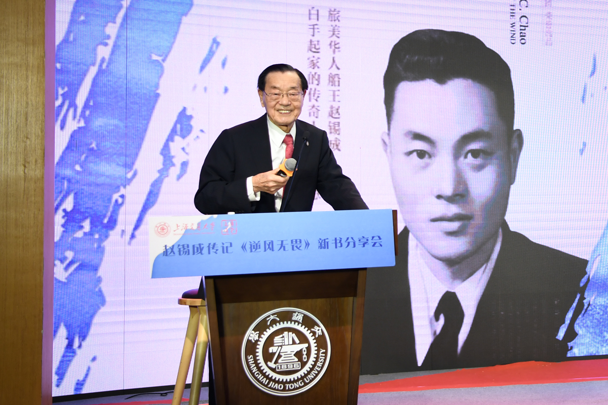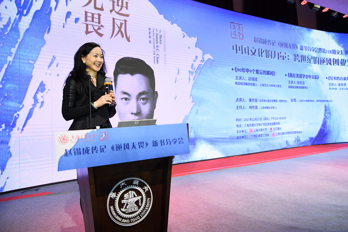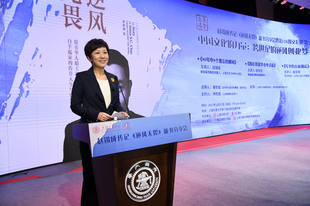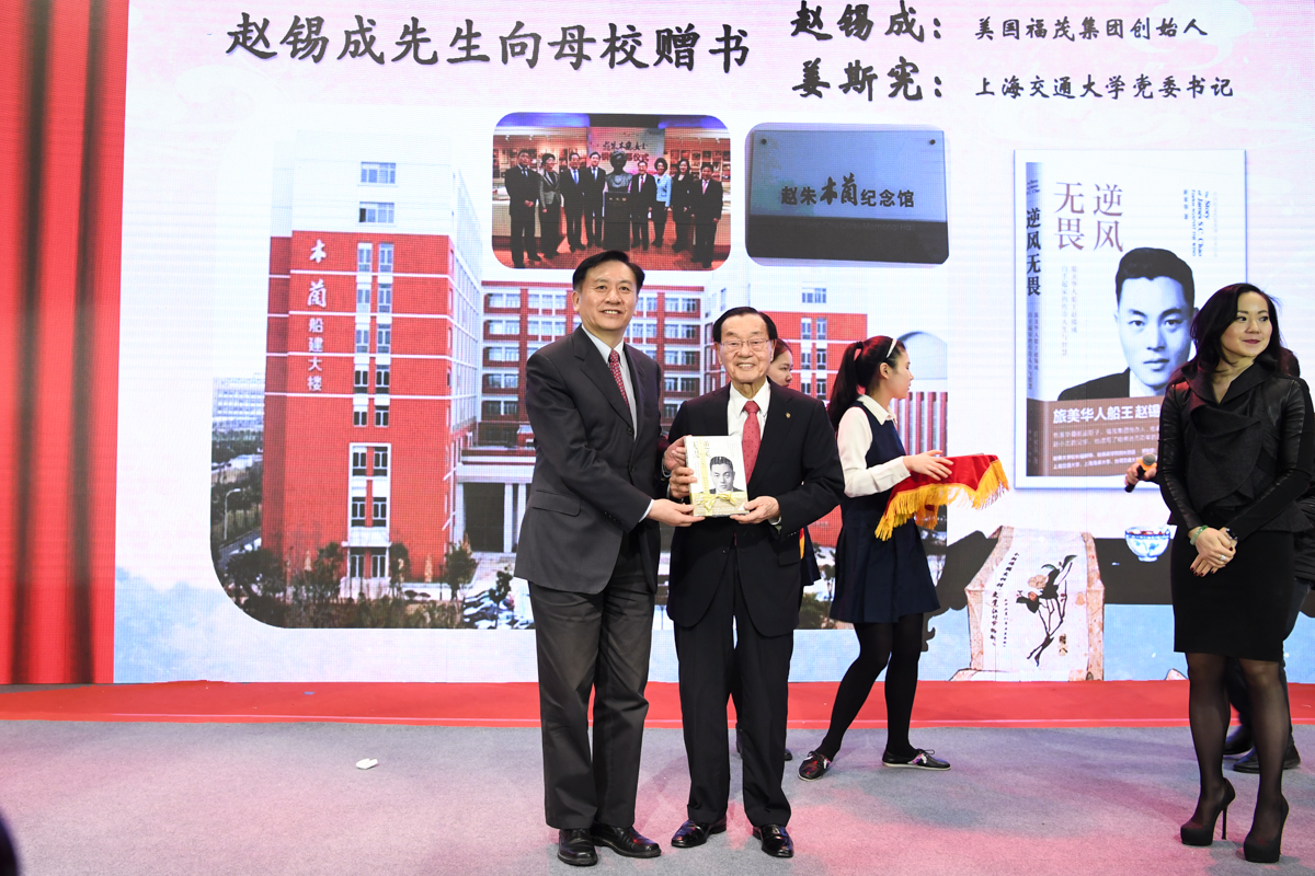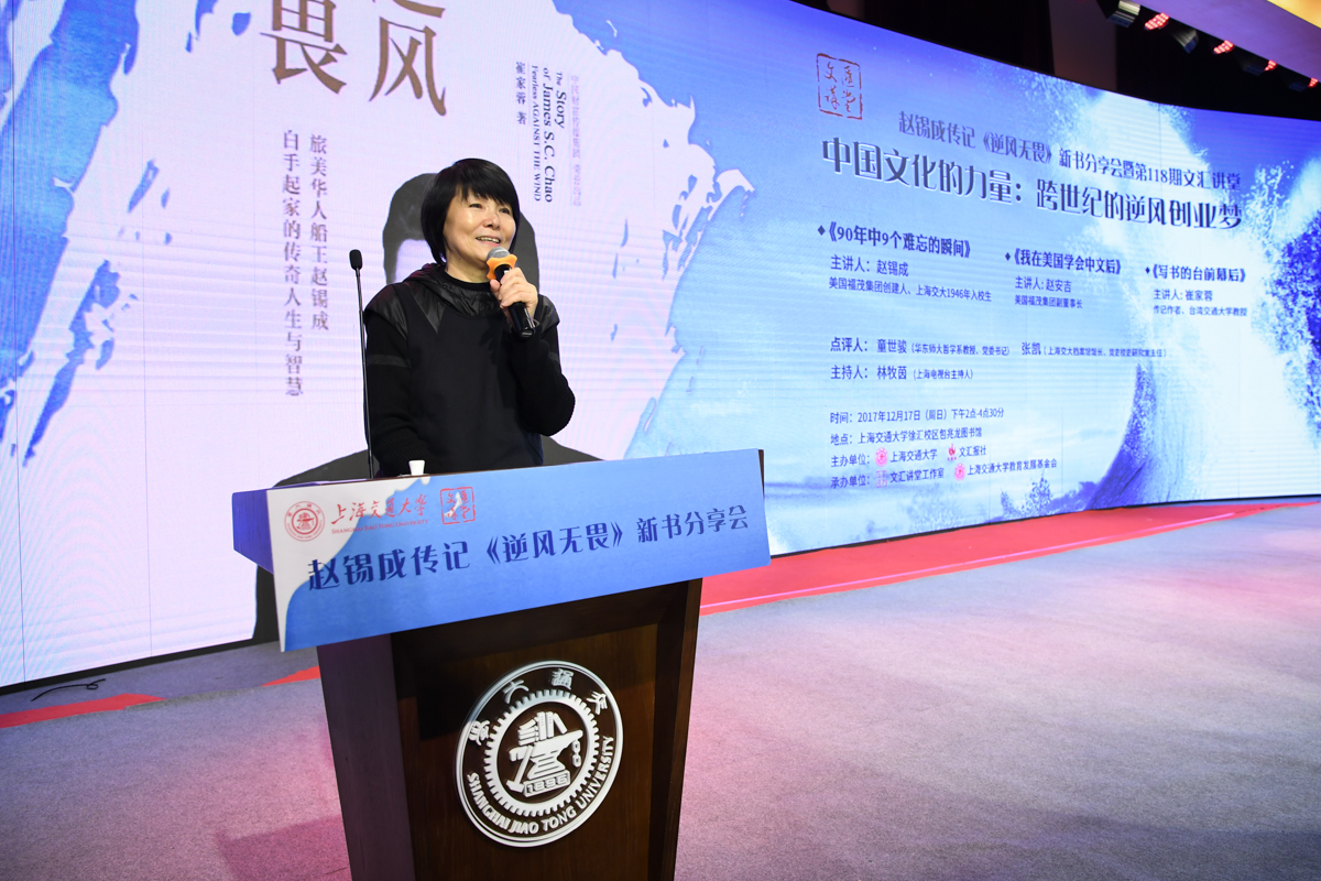 丁酉岁末,暖阳融融,游子归家,思源不辍。12月17日,古朴清幽的徐汇校区包兆龙图书馆演讲厅迎来了著名校友、旅美华人船王、福茂集团董事长赵锡成学长,六女儿、福茂集团副董事长赵安吉女士,传记作者、台湾交通大学教授崔家蓉女士一行,做客文汇讲堂,与母校师生及广大读者分享人生经历,共话家国情怀。市人大常委会副主任、校党委书记姜斯宪,党委常委、副校长张安胜表达了全校师生对赵学长及亲友一行的热烈欢迎。市政协对外友好委员会、市侨办、市公共外交协会、市海峡两岸交流促进会、市台办及高校代表出席新书发布会。本次活动由大象传媒 、文汇报社联合主办。上海电视台资深主持人林牧茵主持活动。