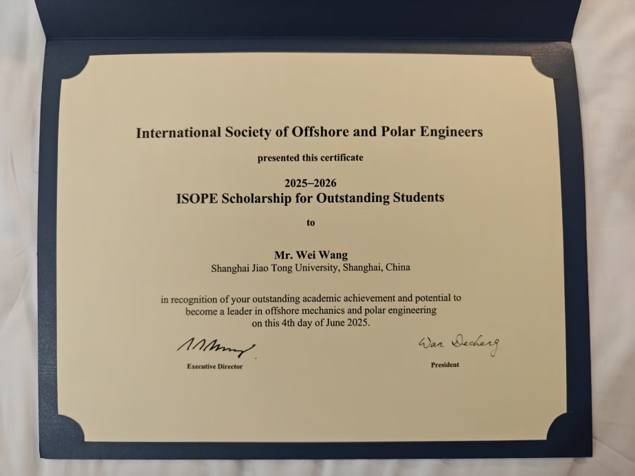船建学子王卫获颁ISOPE Scholarship for Outstanding Students荣誉