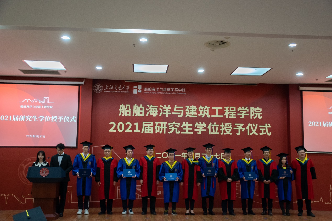 辽宁舰总设计师、中国工程院院士、学院知名院友朱英富学长,学院党委书记周薇,副书记宋续明,副院长杨健,副院长、船舶与海洋工程系系主任薛鸿祥,副院长、工程力学系系主任王本龙,院长助理、船舶与海洋工程系副系主任王鸿东,工会主席、工程力学系副系主任刘铸永,土木工程系系主任陈锦剑,交通运输工程系副系主任杜守继,导师代表、土木工程系教授周岱,研究生教务办主任刘蓉洁,校友工作负责人魏燕,2021届研究生年级思政查芳灵、蒋雨航、史舒婧,以及200余位毕业生出席。仪式由学院党委副书记宋续明主持。