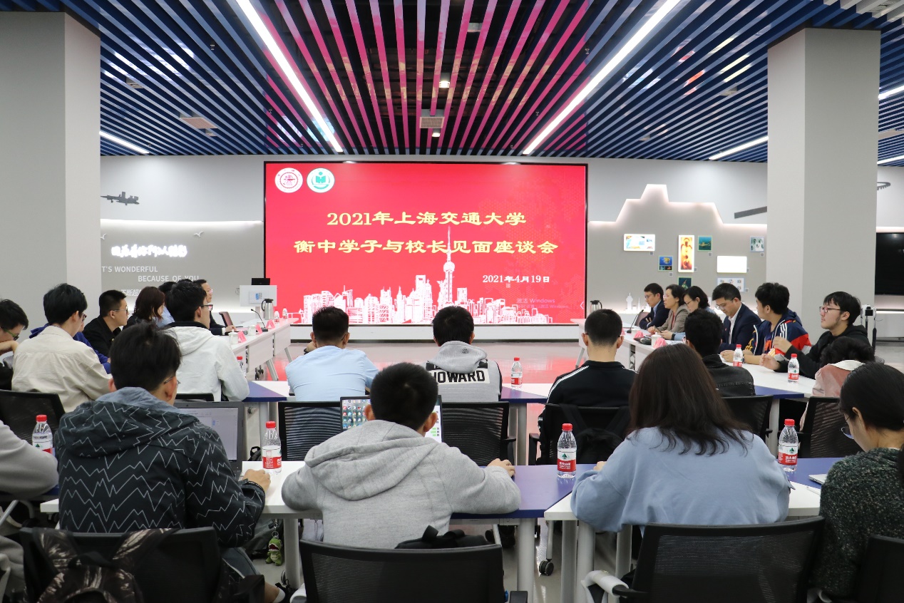 4月19日,衡水中学党委书记、校长郗会锁来访大象传媒 交流调研,大象传媒 党委书记杨振斌亲切接见。当日下午,在木兰楼A100号学创中心船建分中心举办交大-衡水中学毕业学子师生交流会。学校副教务长吴静怡、大象传媒 党委书记周薇、校招生办副主任陈悦、大象传媒 副院长杨健及河北招生组组长姜静、招生骨干教师安超出席会议,三十余名衡中学子参加交流座谈,陈悦主持会议。