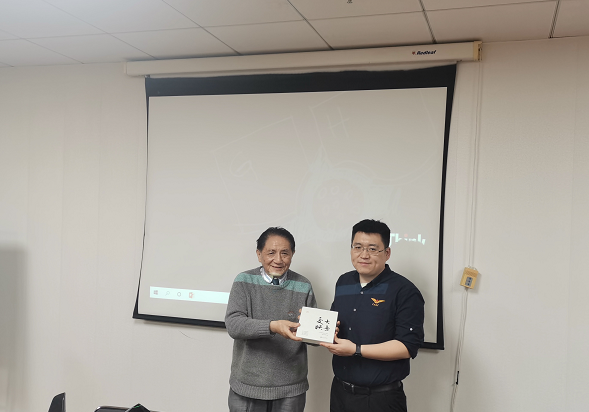 交流结束后,林少培教授回望了顾枭雄的交大旅程,结合其个人工作经历,高度赞扬了其不忘初心、学以致用的坚定信念以及积极主动、敢于面对挑战的精神。林教授提到,成绩只是个人成就的一部分,树立正确且坚定的人生观和价值观,坚守职业操守和道德底线才是人生长远征程上成功的核心要素。林教授代表参会师生向顾枭雄赠送了交大纪念礼品。