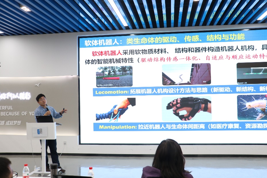 机械与动力工程学院的谷国迎教授作了题为《软体机器人技术的研究进展与思考》的报告。首先介绍了软体机器人的研究背景和目标。指出构成软体机器人的材料,基于材料的特性不同,可分为被动和主动两种软体材料。详细介绍了其团队对不同软体材料的作动机理解析与机构一体化设计工作以及在软体驱动器、传感器与机构设计及在可穿戴机器人系统集成应用方面的进展与思考。
