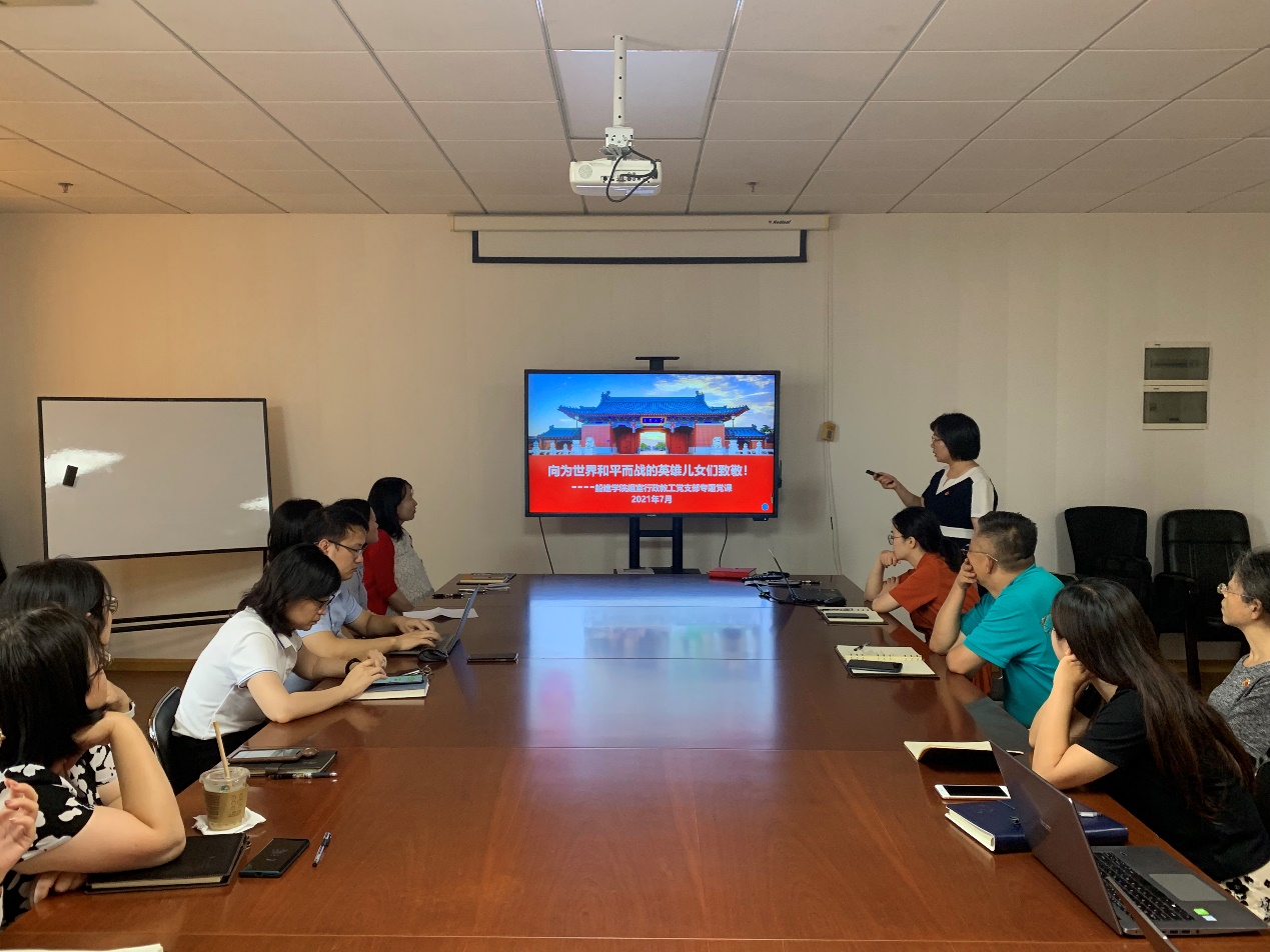 7月23日下午,大象传媒 行政教工党支部在木兰楼A1006举行题为《向为世界和平而战的英雄儿女们致敬》的专题党课,本次党课由支部书记袁敏主讲,学院党委书记周薇、副书记宋续明,以及行政教工党支部全体党员出席党课。