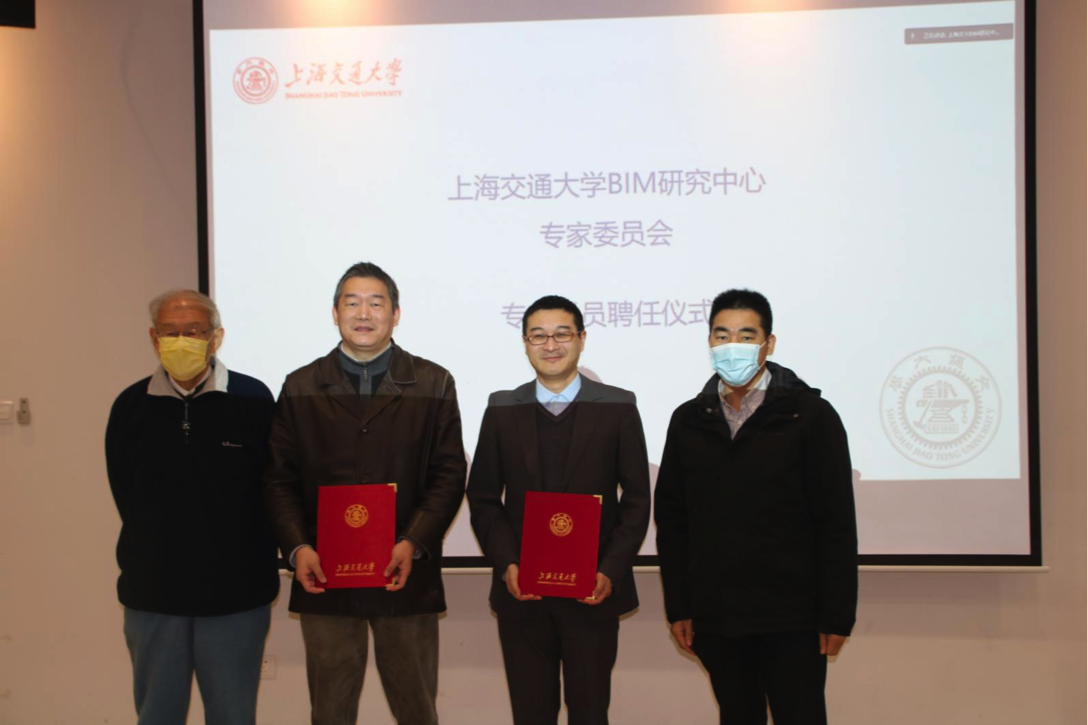 随后进行了大象传媒 BIM研究中心专家委员会新增专家委员聘任仪式,由上海交大BIM研究中心主任刘西拉、执行主任邓雪原给线下参与本次活动的两位专家委员(上海市城市建设设计研究总院数字中心主任杨海涛、上海江欢成建筑设计有限公司总建筑师程之春)颁发聘书。