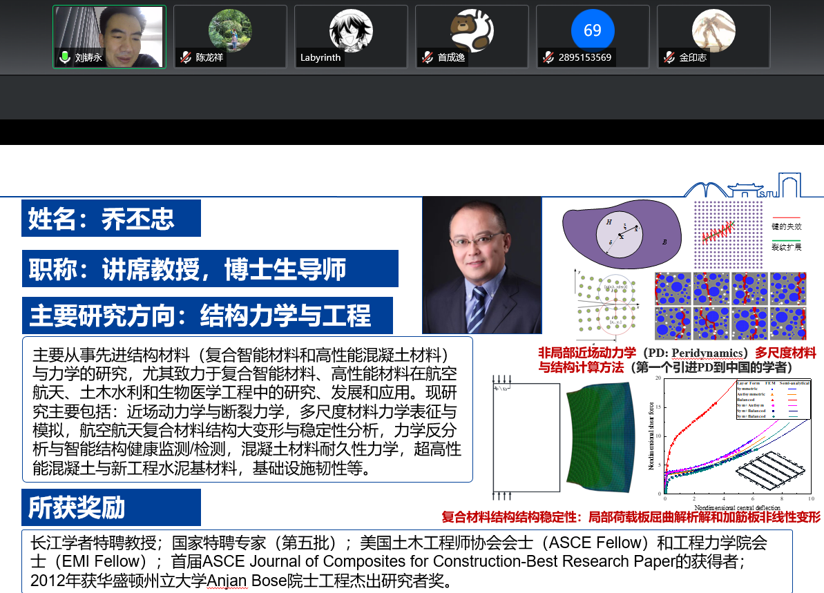 刘铸永按工程力学系不同二级学科方向:动力学与控制、固体力学、流体力学以及实验力学对38位导师的研究方向、科研成果以及所获奖励等方面向学生进行了详细介绍。