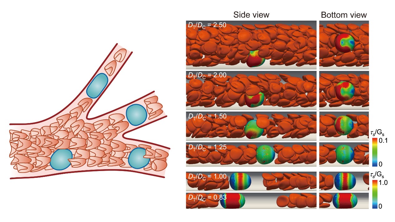 图1. 循环肿瘤细胞和红细胞在不同直径的微血管中的运动和受力