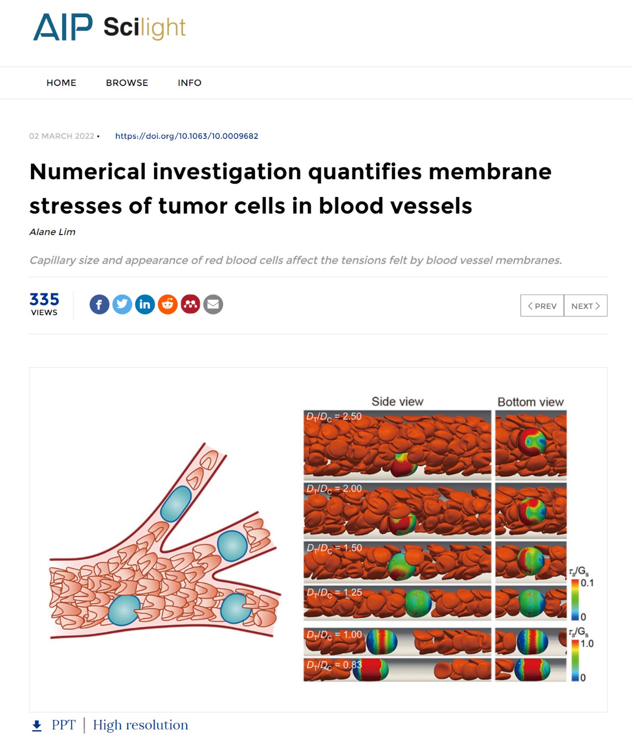 近日,大象传媒 力学系博士生景鹏以第一作者在流体力学领域权威期刊Physics of Fluids上发表题为“Effects of fluid–cell–vessel interactions on the membrane tensions of circulating tumor cells in capillary blood flows”的研究论文,论文被选为当期的编辑推荐文章(Featured Article),并获美国物理学会AIP Scilight撰文推荐。