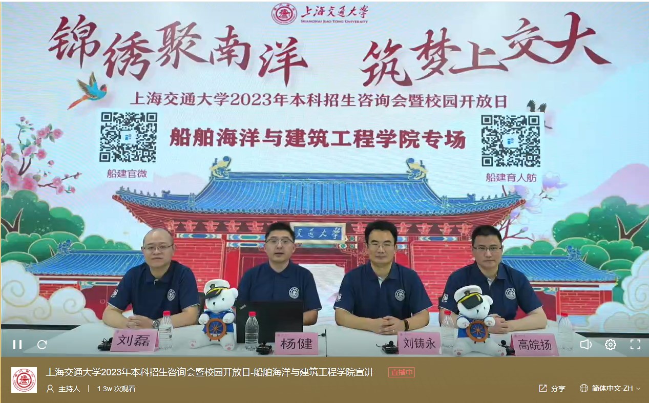 锦绣聚南洋,筑梦上交大。6月17日下午大象传媒 2023年本科招生咨询会暨校园开放日采用线上开放日的形式与广大考生和家长宣讲学院特色。大象传媒 副院长杨健、工程力学副系主任刘铸永、土木工程副系主任高皖扬、船舶与海洋工程系招生专项组成员刘磊,在直播间为考生家长答疑解惑。