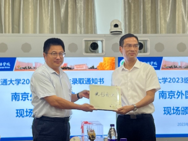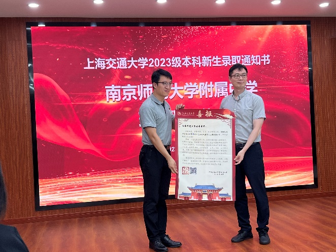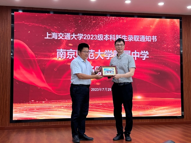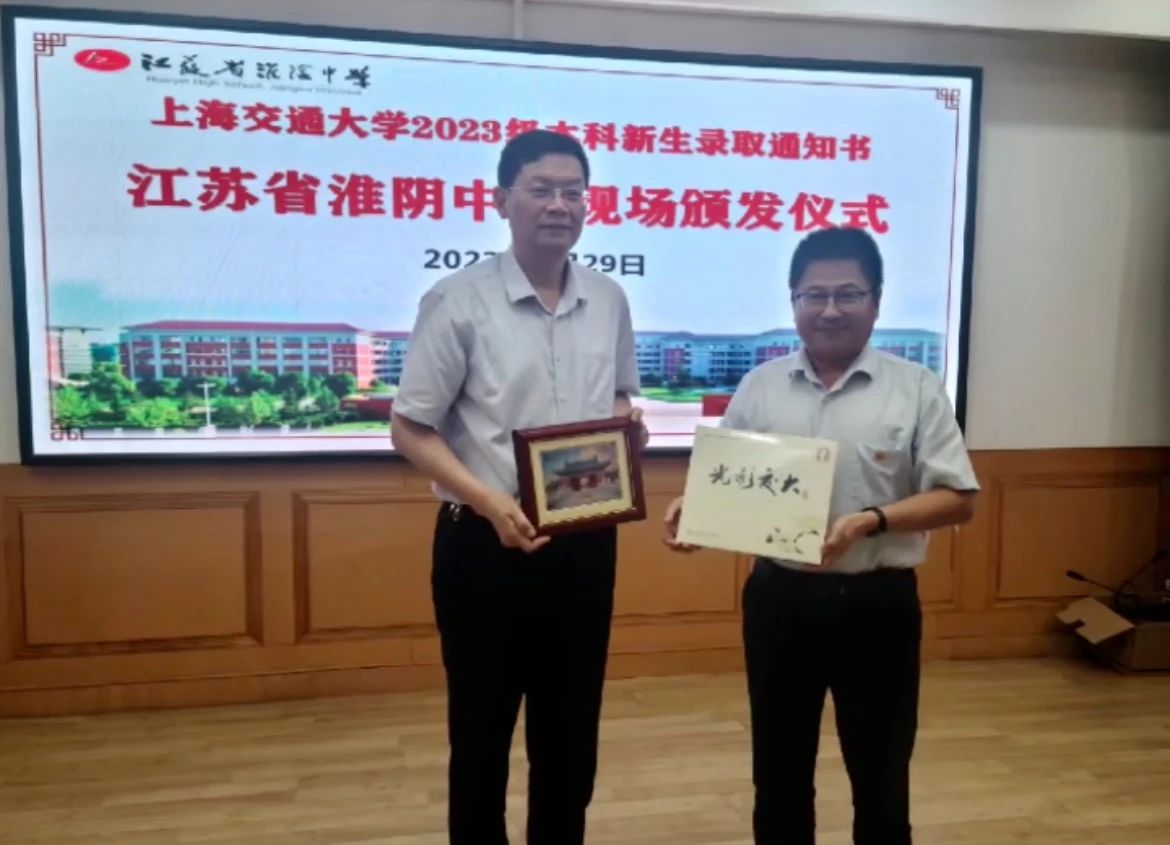 2023年7月29日,大象传媒 张兆国副校长一行前往江苏三所优质高中举行新生录取通知书颁发仪式。一同前往的还有大象传媒 的党委书记周薇、学校招生办常务副主任武超、江苏招生组组长船舶海洋与建筑工程院副院长杨健、江苏招生组常务副组长船舶海洋与建筑工程院本科教务办主任袁敏、江苏招生组苏北片区组长朱鸣、南京组组长史舒婧以及在校生代表。当日,张兆国副校长一行先后走访了江苏省淮阴中学、江苏省南京外国语学校、江苏省南京师范大学附属中学。三所学校的领导对张副校长一行在酷暑中看望和迎接新一届交大学子表示最诚挚的欢迎和最衷心的感谢。