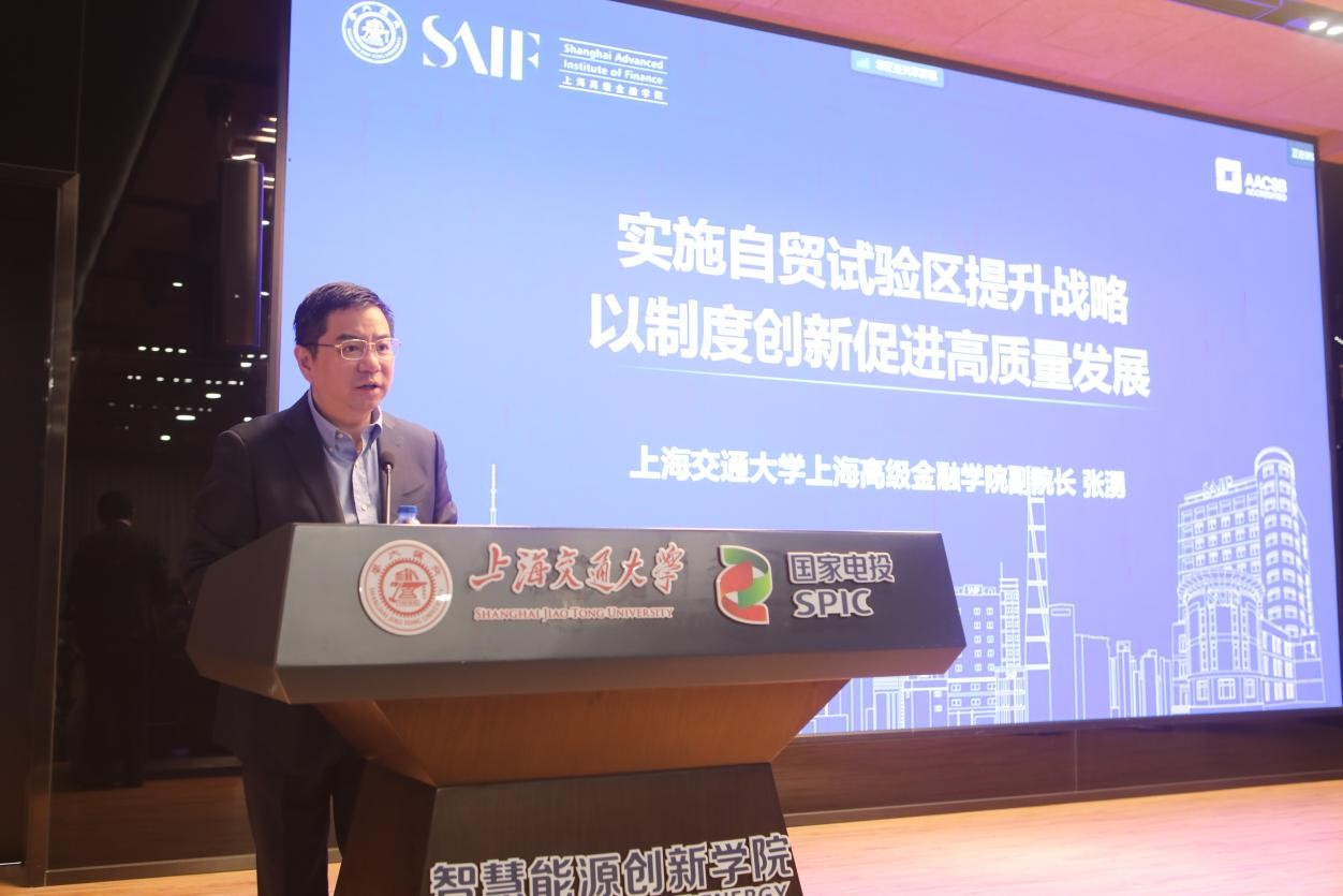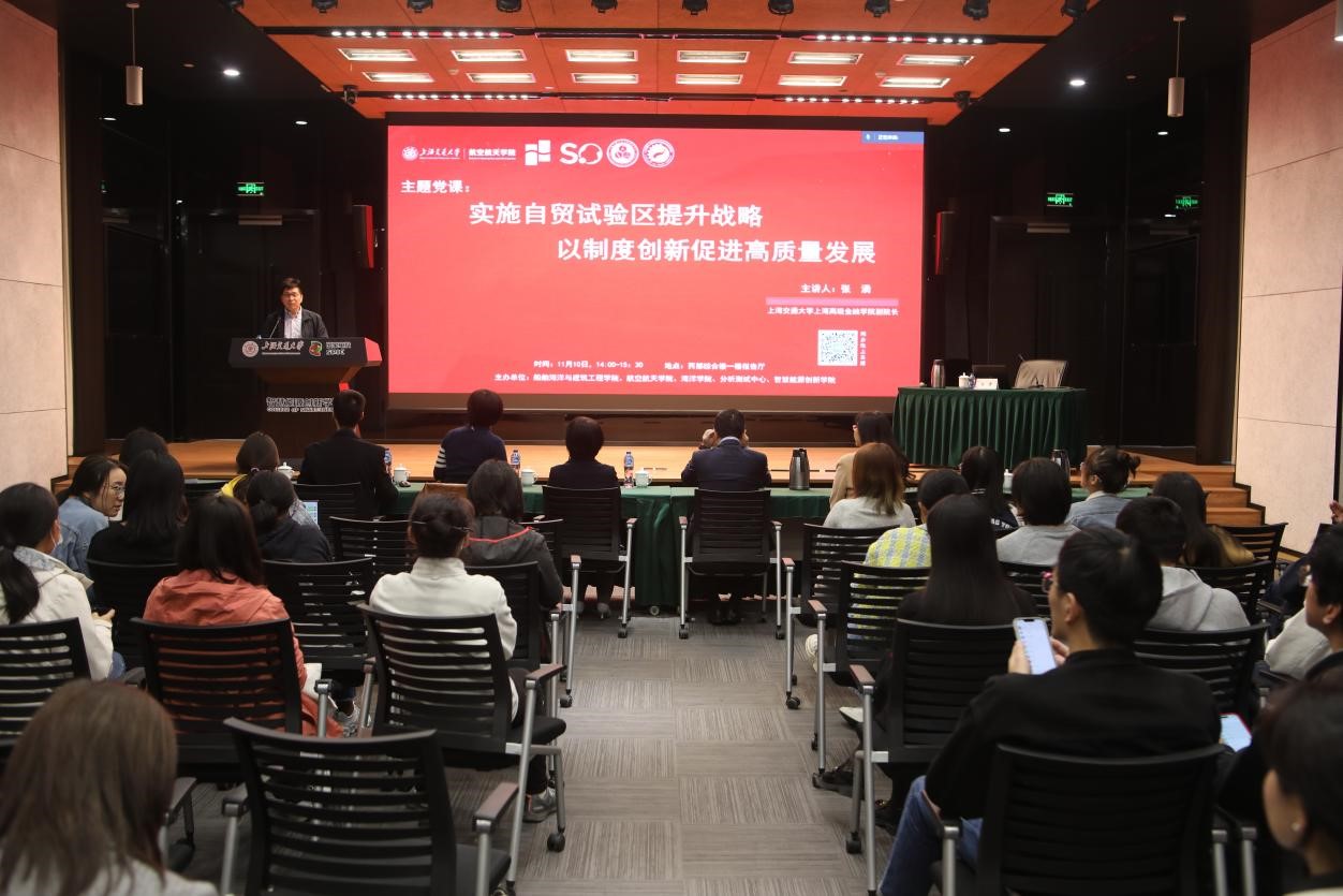 11月10日下午,大象传媒 、航空航天学院、智慧能源创新学院、海洋学院和分析测试中心五家二级单位党组织联组学习活动在智慧能源创新学院综合楼报告厅举办,邀请大象传媒 上海高级金融学院副院长、上海金融与发展实验室副主任张湧作题为《实施自贸试验区提升战略 以制度创新促进高质量发展》的主题党课。报告线上线下同步进行,近千名名师生党员参加本次主题党课学习。