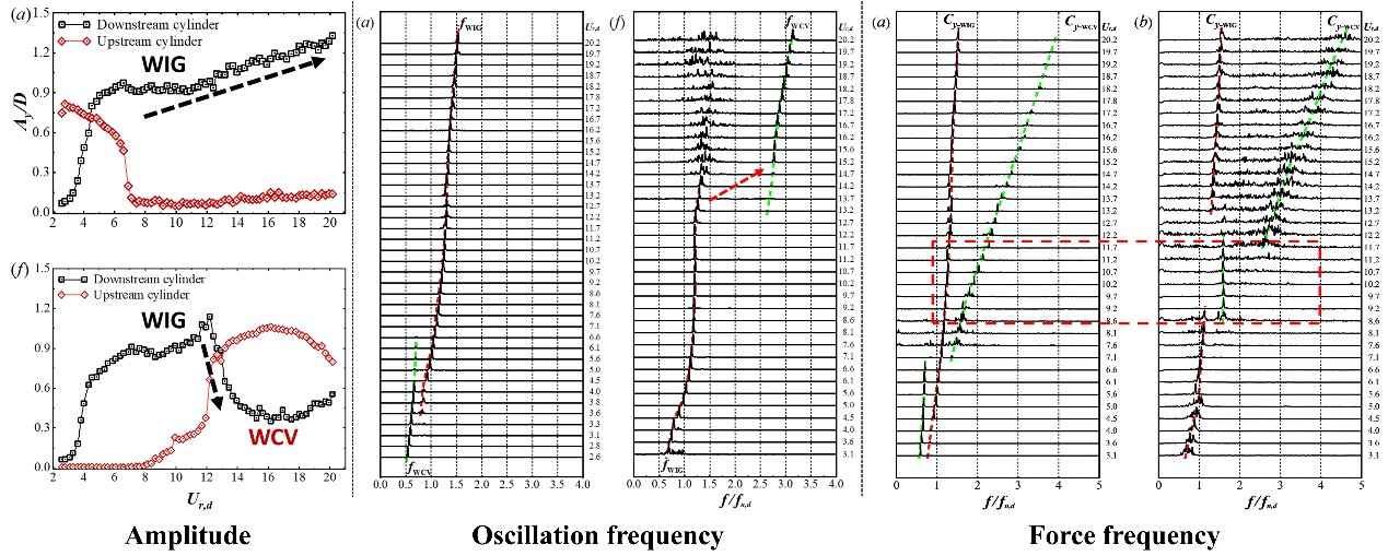 研究团队通过采用先进的流固耦合动力学智能实验技术,揭示了圆柱结构在不同模式的卡门涡街流动下,分别表现出两种独特的流固耦合动力学行为——尾流驰振(Wake-induced galloping)和尾流俘振(Wake-captured vibration)。其中,尾流驰振突破了典型涡激振动的幅值自限特性,表现为振动强度的持续增长;而尾流俘振则突破了涡激振动的频率自锁特性,振动频率完全锁定到来流涡街频率。值得一提的是,研究团队首次命名并定义了尾流俘振这一振动模式。
