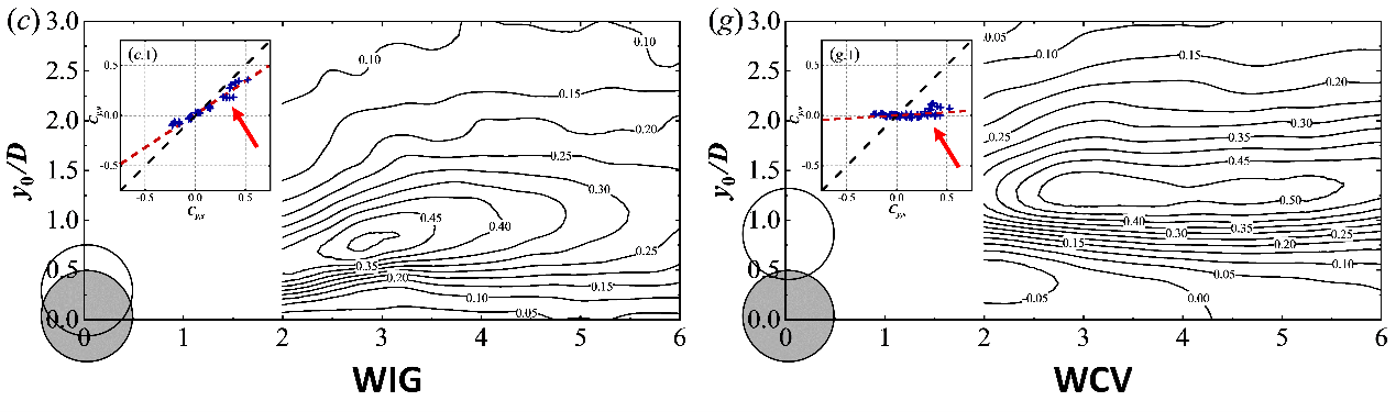 图2 WIG与WCV响应中卡门涡街准静态升力系数谱与升力梯度特征
