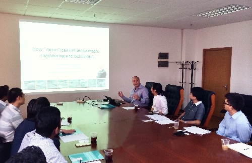 交流会由杨健主持。会上,杨健首先简单介绍了上海交大以及交大土木系的综合情况,随后介绍了绿色建材与新型结构团队的研究方向及相关科研成果。接着,C.S. Chin就西交利物浦大学的整体概况、土木工程系的师资力量、实验条件、教学理念、学位设置、研究方向等情况进行简要介绍。