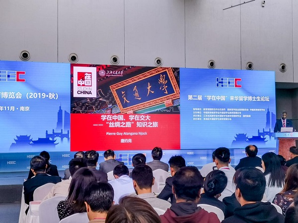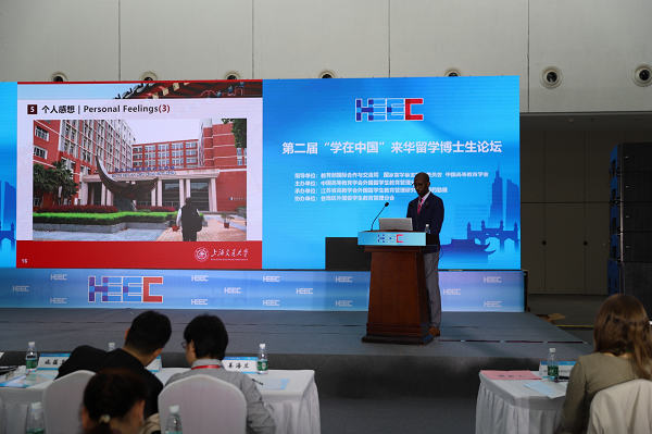 我校大象传媒 2016级博士研究生、喀麦隆籍唐约克(Pierre Guy Atangana Njock)经学校国际合作与交流处留学生发展中心及研究生院组织推荐、筛选,通过全国初选并于10月31日在全国分论坛上汇报来华留学成果。同台汇报的有来自清华大学,浙江大学,哈工大,北京航天航空大学等15名优秀来华博士生。后经专家评审一致推荐唐约克同学代表全国理工组参加11月1日第二届“学在中国”来华留学博士生总论坛汇报。