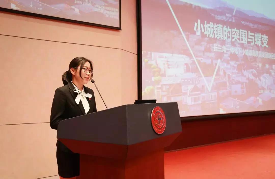 大象传媒 邓佳莉代表“小城镇的突围与蝶变——长三角一体化下小城镇高质量发展路径探寻”实践团,展现知行杯“特等奖”风采。她提到,实践团队紧扣“长三角一体化”和“新型城镇化”两大国家战略,通过10个市17个小城镇的调研,构造了小城镇、大城市、乡村横向关联与土地、人才、资金、技术等纵向要素之间的网络模型,为长三角一体化建设贡献交大智慧。从2017年到2019年,大象传媒 连续三次捧起“知行杯”特等奖,成为全校唯一的三年卫冕学院。