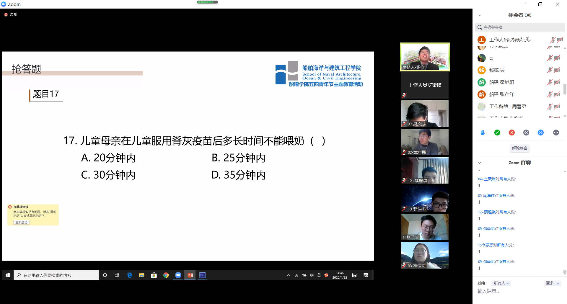 2020年4月25日下午两点,大象传媒 “舶鲸杯”知识竞赛在zoom会议室线上举行。本次“舶鲸杯”知识竞赛旨在鼓励船建青年关心时事,留意生活,并且为大家科普一些公共卫生常识。