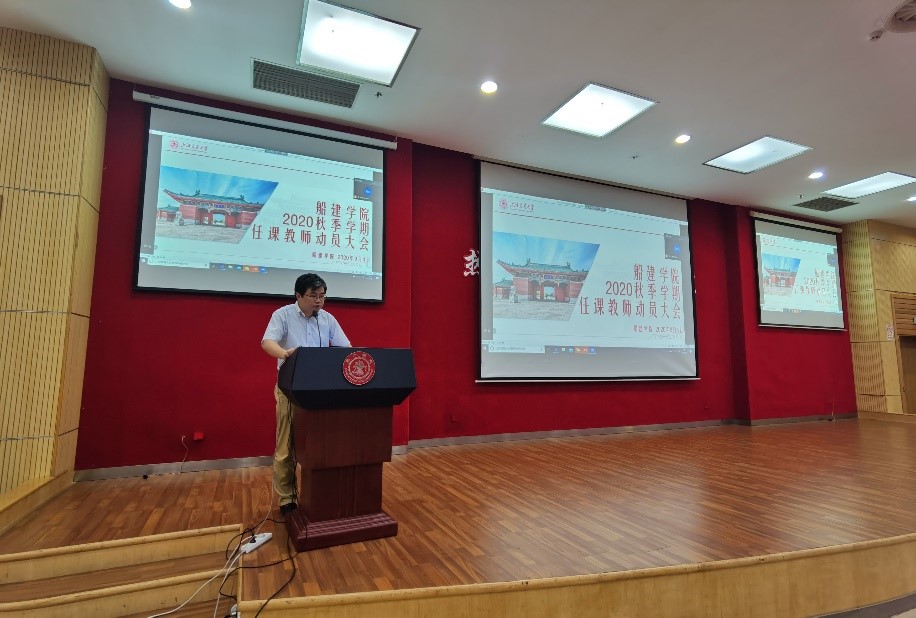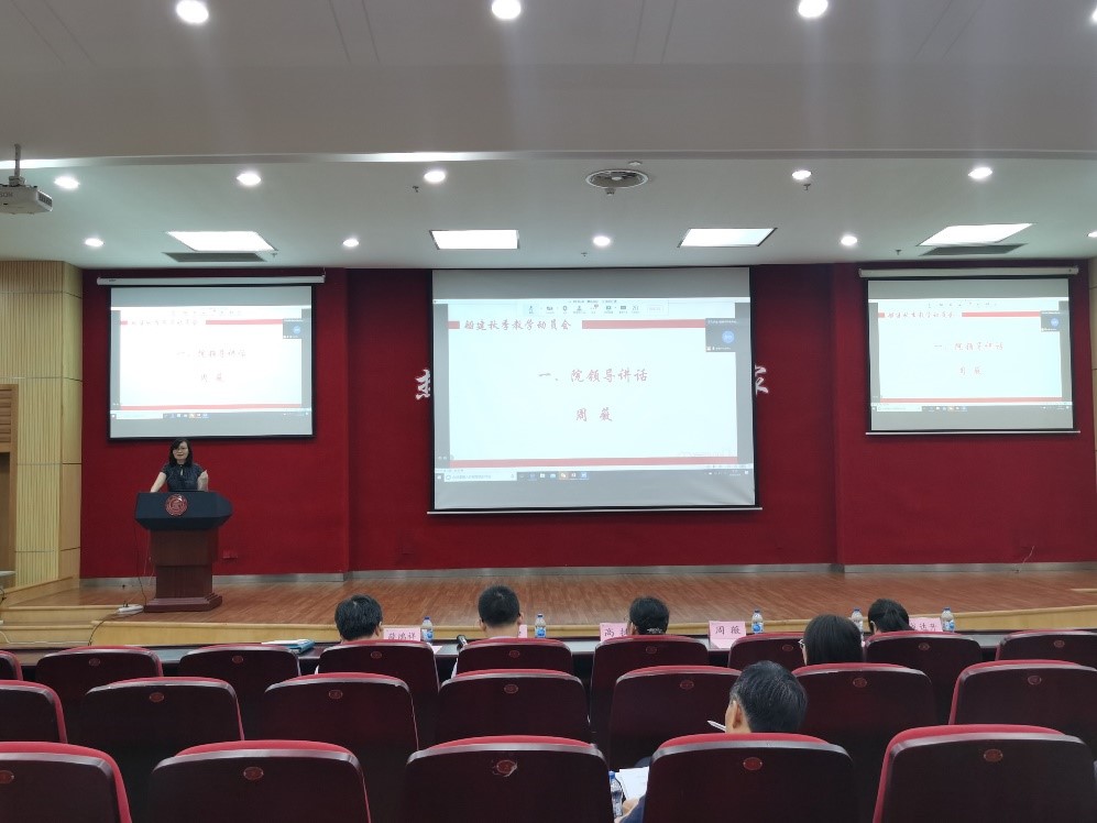 9月4日,大象传媒 2020年秋季学期任课教师动员大会在木兰楼A200报告厅和腾讯会议平台同时举行。大象传媒 教学发展中心顾问高捷、教育技术中心指导教师邵晶晶、戈达开应邀莅临我院。院党委书记周薇,副院长杨健、薛鸿祥,本科教务办主任袁敏,研究生教务办主任刘蓉洁及各系任课教师等百人出席。